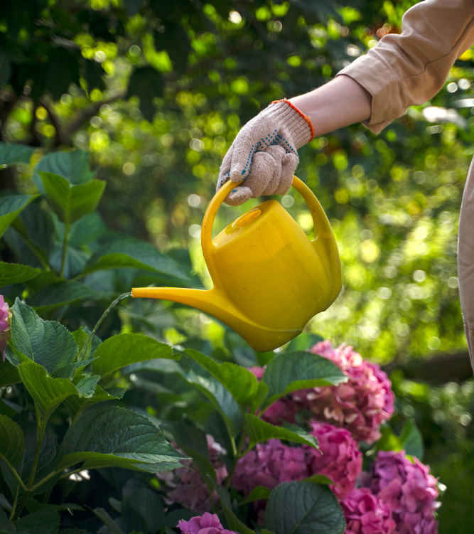 Watering your landscaping is crucial and often overlooked. It is important to water your landscaping regularly because annual rainfall is not adequate to keep your landscaping healthy. Check plants to see if they need watering by inserting your finger 2-3” into the soil at the base of the plant where the stem meets the soil. If the soil is cool and moist, your plants are good and do not need water. If it is dry and crumbly to the touch you need to water. Run hose water at a thumb size trickle at the base of the plant until saturated, about 3-5 minutes for small plants. You may need to run the hose longer for larger trees and shrubs to reach saturation. This slow intake of water will allow for a deeper root system to develop which in turn will protect the plant during extended periods of drought. It is best to water each plant individually rather than running a sprinkler, to avoid leaf disease.